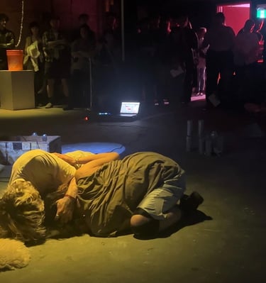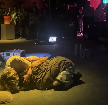 eighteen and a half minutes long live duet performance featuring zero sugar white Monster, baptisms, vocal roasting with lustful gazes and intimate touch. We play with homoerotic-homophobic-sensual gym bro culture except Roberto and Suzy are lovers and have never performed together before but love is stronger than performance.